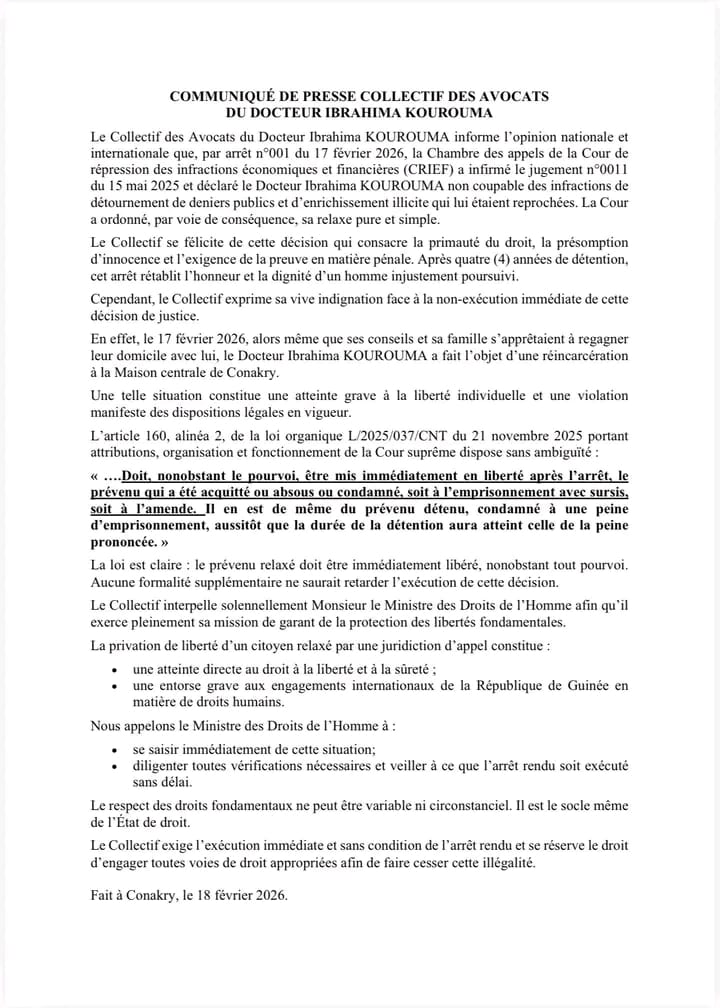 Le collectif des avocats du Dr Ibrahima Kourouma annonce qu’un arrêt rendu le 17 février 2026 par la Chambre des appels de la Cour de répression des infractions économiques et financières (CRIEF) a infirmé le jugement de première instance et déclaré leur client non coupable des faits de détournement de deniers publics et d’enrichissement illicite.