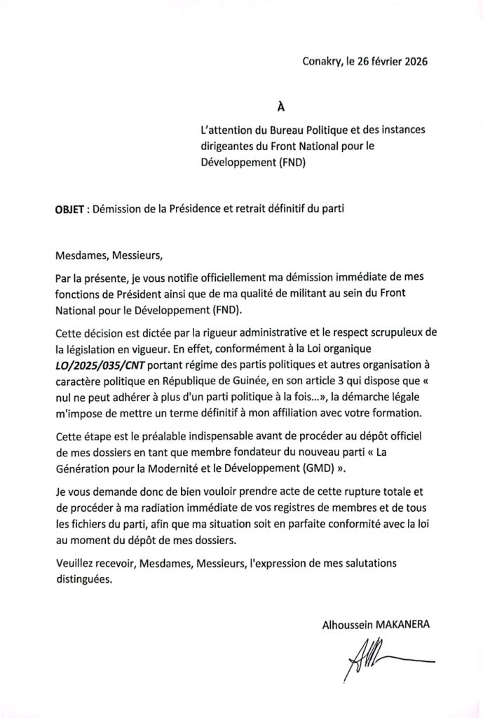 Alhoussein Makanera Kaké vient d’annoncer sa démission de son parti le Front National pour le développement ( FND).