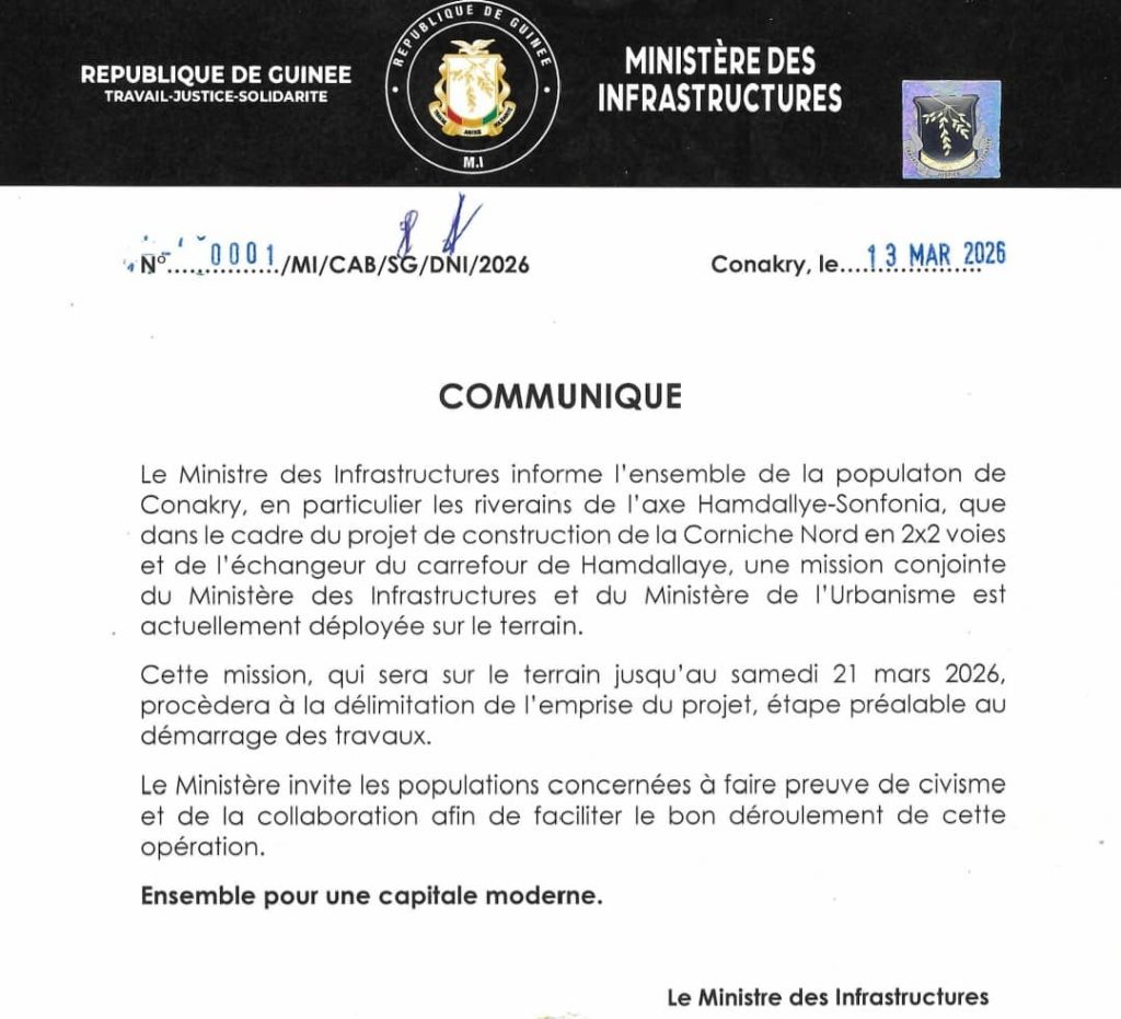 Le ministère des Infrastructures et des Travaux publics annonce qu’une mission est actuellement sur l’axe Hamdallaye-Sonfonia en passant par la corniche Nord. Cela s’inscrit dans le cadre du projet de construction de cette corniche 2×2 voies et l’échangeur de Hamdallaye.