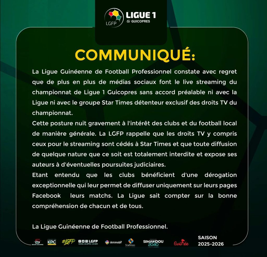 La Ligue guinéenne de football professionnel (LGFP) hausse le ton. Dans un communiqué publié ce jeudi 6 novembre, elle condamne fermement la diffusion en streaming non autorisée des rencontres du championnat national de Ligue 1 Guicopres.