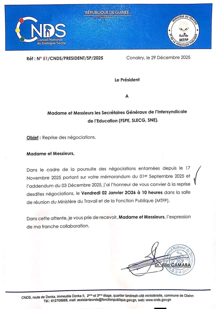 Le Conseil National du Dialogue Social ( CNDS) annonce la reprise des négociations ce vendredi 02 janvier 2026.