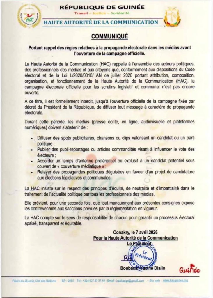 L’institution de régulation des médias en République de Guinée avertit les entreprises de presse sur une quelconque propagande électorale avant la période de campagne prévue pour les élections législatives et communales annoncées pour le 24 mai 2026.