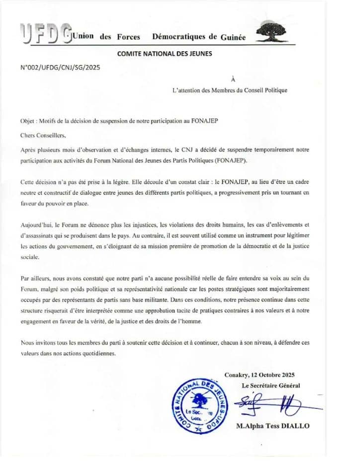 Dans le courrier dont guineesouverain dispose, le CNJ de l’UFDG souligne que ‘‘l’institution, au lieu de demeurer un espace de dialogue et de plaidoyer neutre, semble désormais s’orienter vers la promotion des activités du gouvernement en place’’