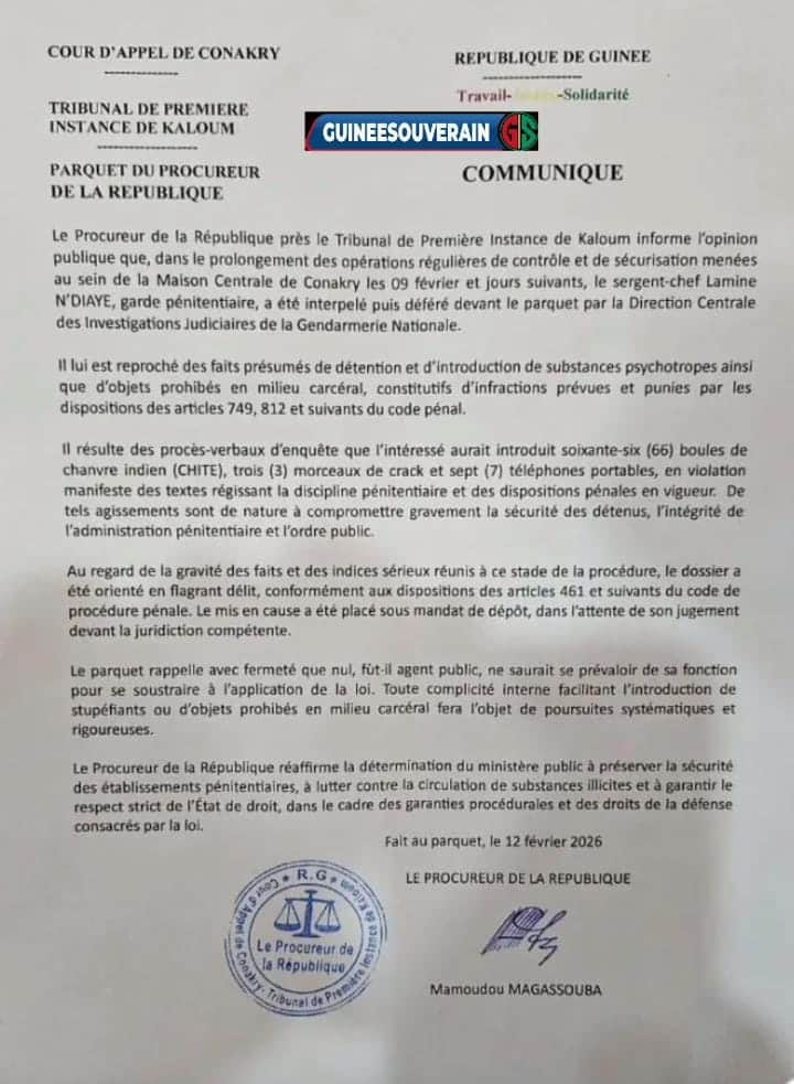 Le procureur de la Rรฉpublique prรจs le Tribunal de premiรจre instance de Kaloum a annoncรฉ lโ€™interpellation et le dรฉferrement dโ€™un garde pรฉnitentiaire en service ร  la maison centrale de Coronthie.