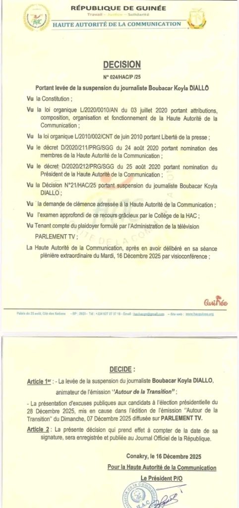 La Haute Autorité de la Communication annonce la levée de la suspension du journaliste de la radio parlementaire Boubacar Koyla Diallo.
