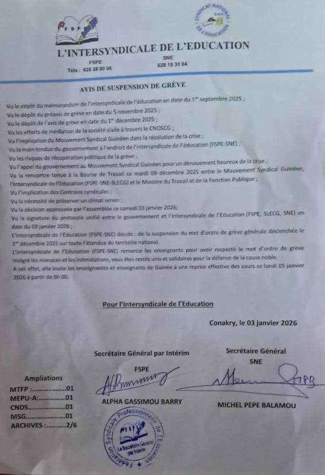 Dans une déclaration conjointe lue par Aboubacar Diesto Camra, le SNE et la FSPE ont appelé tous les enseignants à reprendre les cours sur l’ensemble du territoire national à partir du lundi 5 janvier 2026. Cette annonce survient après l’accord conclu entre les syndicats de l’Education et l’exécutif, mettant ainsi fin à une grève qui a profondément affecté le secteur éducatif.