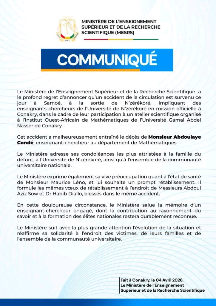 Selon un communiqué du Ministère de l’Enseignement supérieur et de la Recherche scientifique, le drame s’est produit alors que des enseignants-chercheurs se rendaient à Conakry dans le cadre d’un atelier scientifique organisé par l’Institut ouest-africain de mathématiques de l’Université Gamal Abdel Nasser.