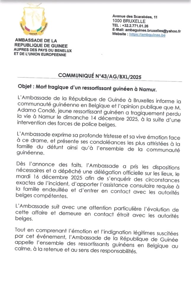 Un Guinéen mort lors d’une intervention policière en Belgique : l’ambassade de Guinée à Bruxelles appelle au calme