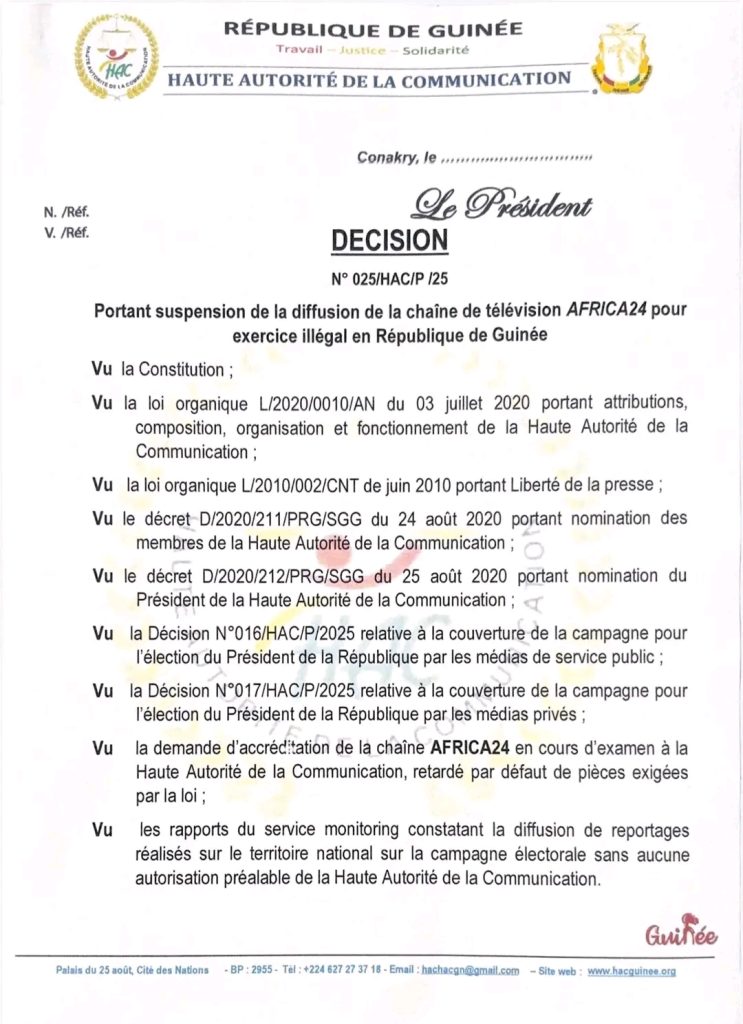 Urgent : la HAC suspend la chaîne Africa24 en Guinée pour ”exercice illégal du journalisme”